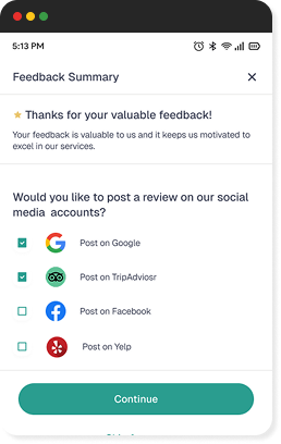 Encourage customers to complete their feedback and share reviews on connected social platforms like Google, Facebook, and TripAdvisor — boosting visibility and customer engagement.